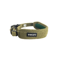 Pannan pehmeä vakosamettikangas tuntuu miellyttävältä ihoa vasten, eikä hierrä tai paina. Leveä pehmuste jakaa paineen tasaisesti ja tekee pannasta mukavan koirille.