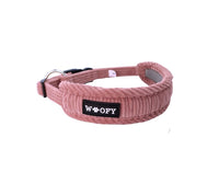 Pannan pehmeä vakosamettikangas tuntuu miellyttävältä ihoa vasten, eikä hierrä tai paina. Leveä pehmuste jakaa paineen tasaisesti ja tekee pannasta mukavan koirille.