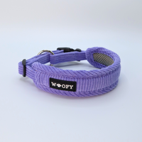 Pannan pehmeä vakosamettikangas tuntuu miellyttävältä ihoa vasten, eikä hierrä tai paina. Leveä pehmuste jakaa paineen tasaisesti ja tekee pannasta mukavan koirille.
